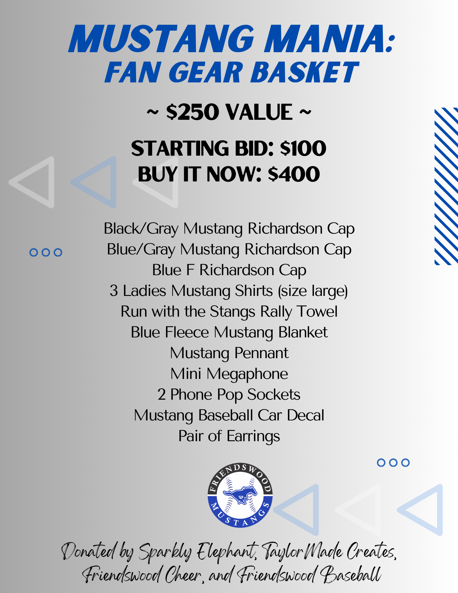 DONATED BY SPARKLY ELEPHANT, TAYLORMADE CREATES, FRIENDSWOOD CHEER, AND FRIENDSWOOD BASEBALL